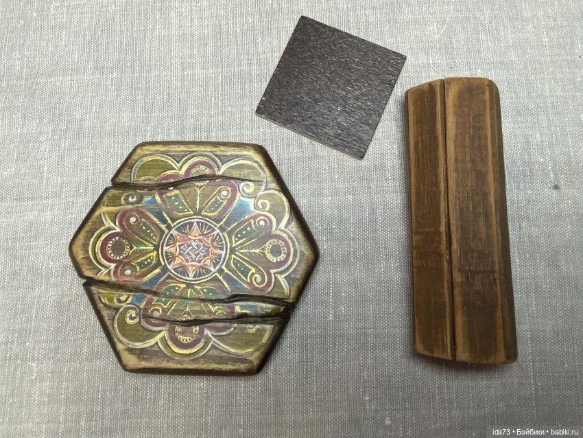 Искуственное состаривание ( не просто зашкурила сверху; а именно и чуть шкуркой, и роспись под патину и трещины, дырочки от короеда, и снова роспись поверх и т д…)