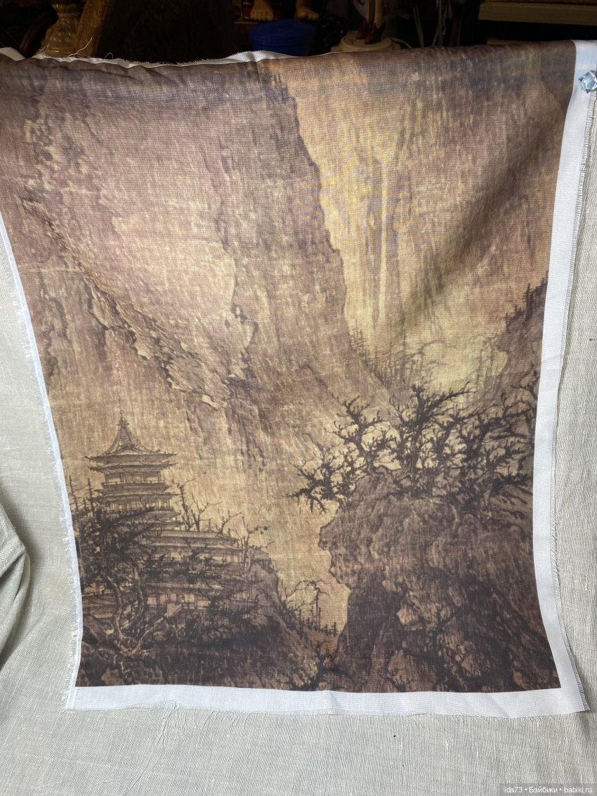 В подарок положу тот фон, что на фото ( это была печать на тонкой полупрозрачной ткани на заказ — типа китайская живопись. Собиралась натянуть на подрамник, поэтому не подшила. )