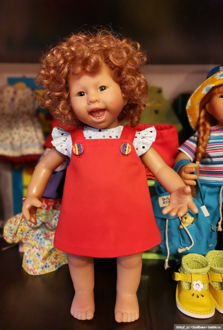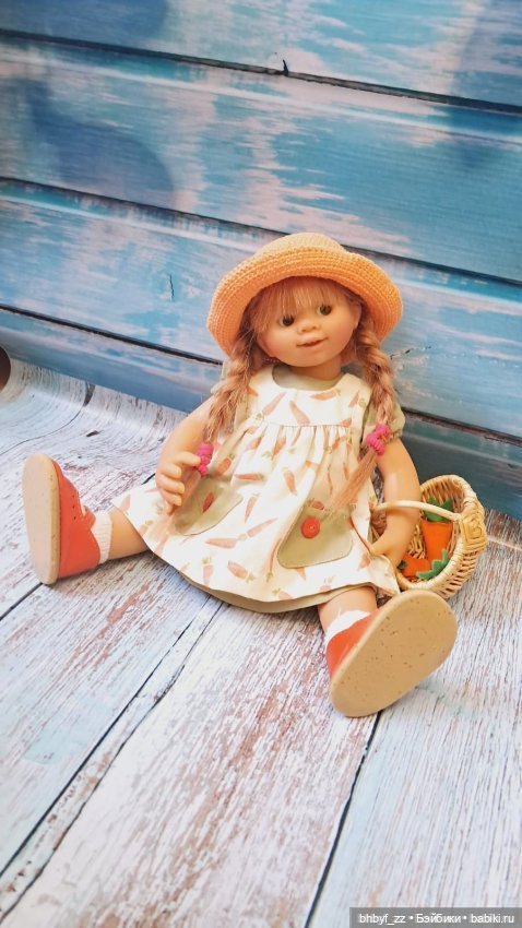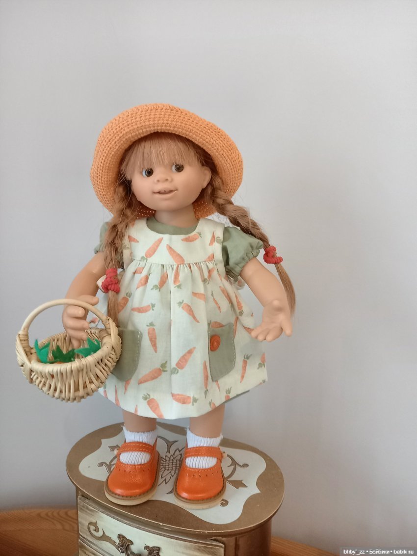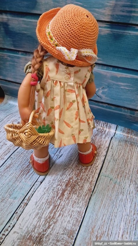 Аутфит состоит из 6 предметов. Аутфит Frieda 2019 года — это нижнее платье, верхнее с морковками, корзинка, носочки. Шляпка связана Ольгой Аникиной. Туфельки кожаные Wagner.
