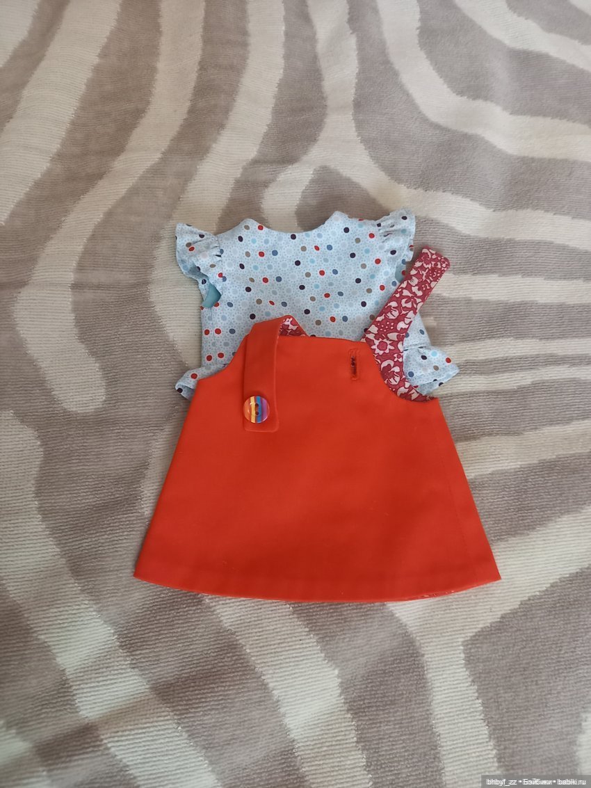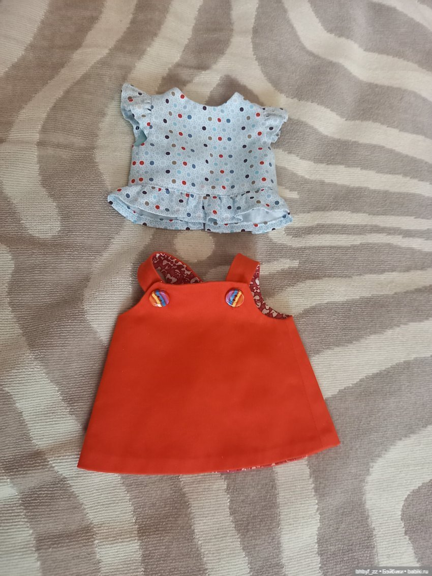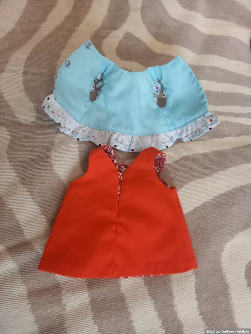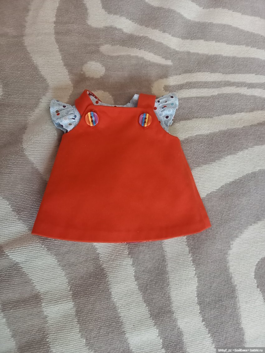 Комплект для вихтеля, состоит из красного сарафаны и распашной голубой кофточки в горошек.