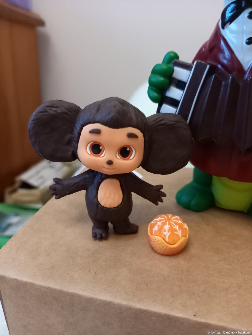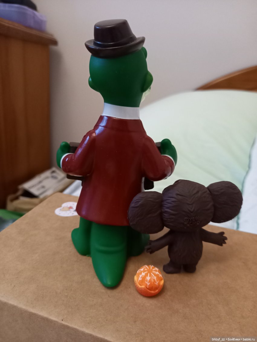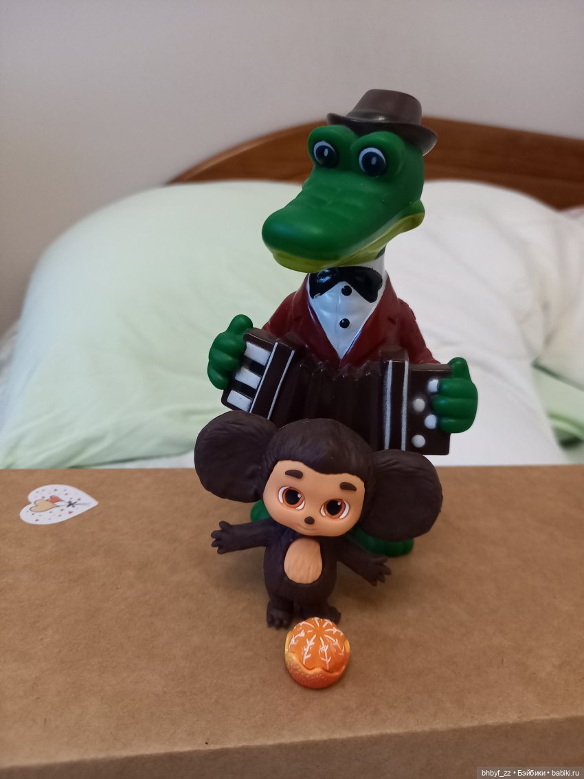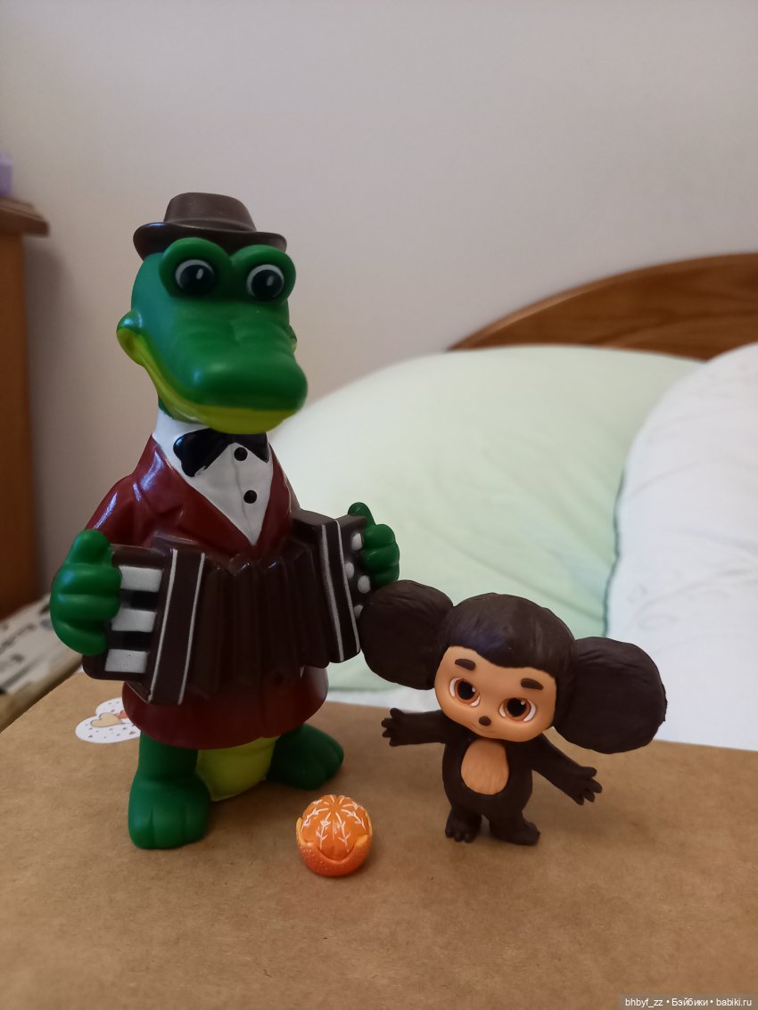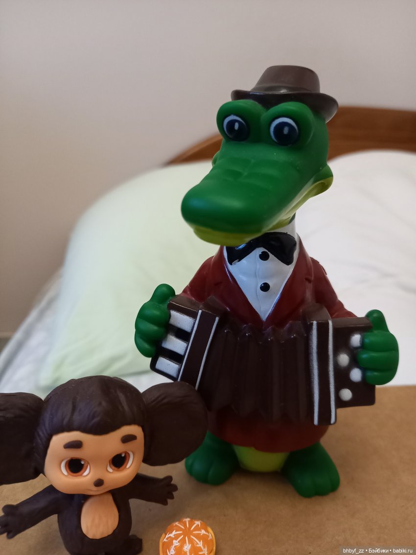 Гена из плотной качественной резины, есть пищик, 14 см, Чебурашка из плотной резины, не полый, стоит неустойчиво сам, за счёт ушей опирается на Гену, рост 6 см, и апельсин.