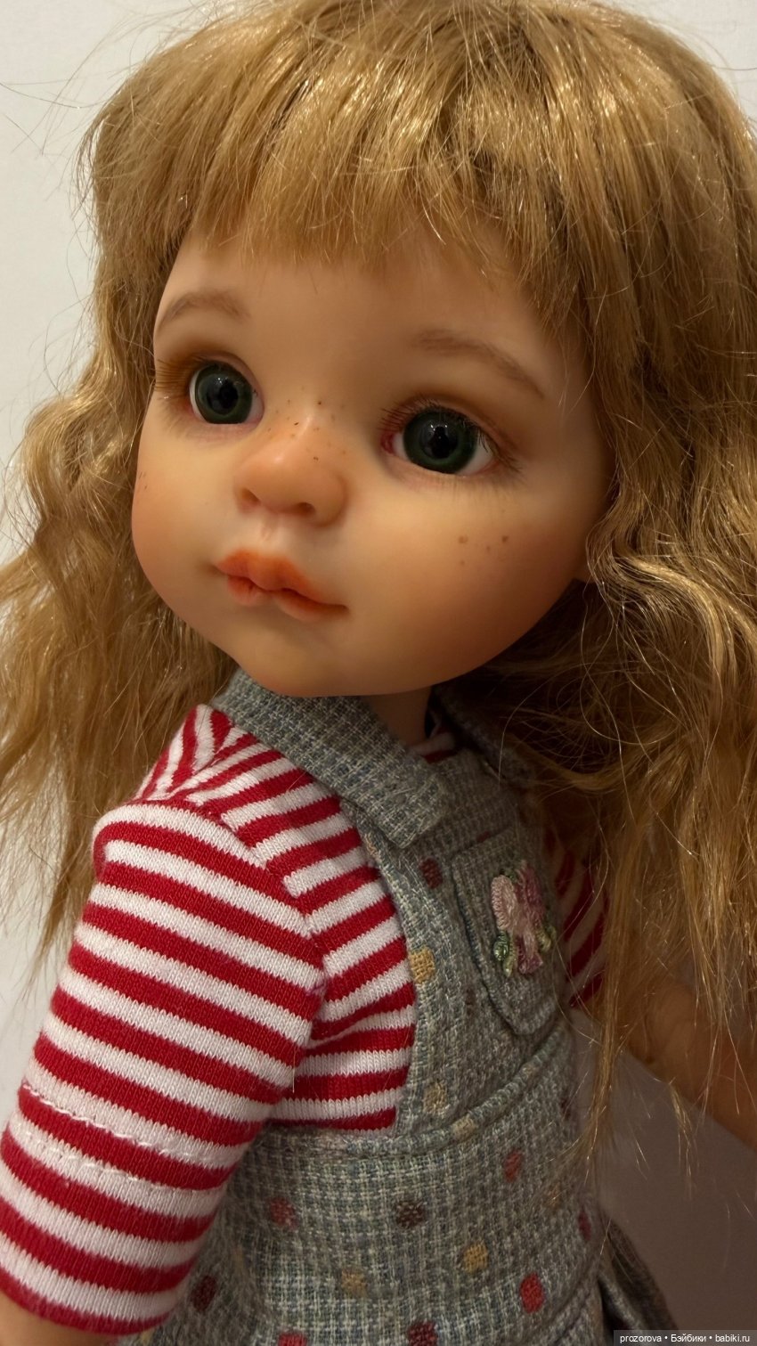Куколке был сделан новый мейк, закреплён послойно японским супер клиром с УФ, глазки заменены на стеклянные, зелёного цвета, парик отличного качества, можно расчёсывать и делать причёски.