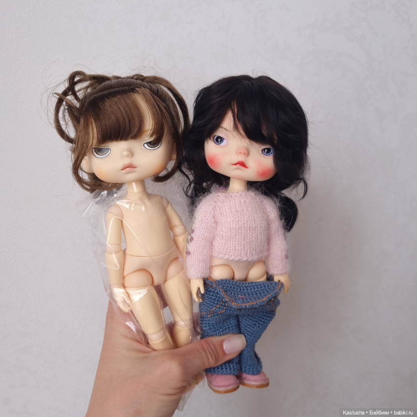 Парик натуральный, съёмный. Глаза поворотные. Тело шарнирное, шарниры тугие, кроме тазобедренных, чуть свободнее двигаются. На груди есть точка.