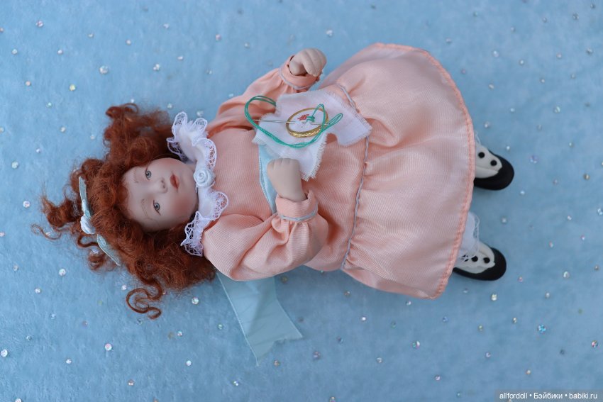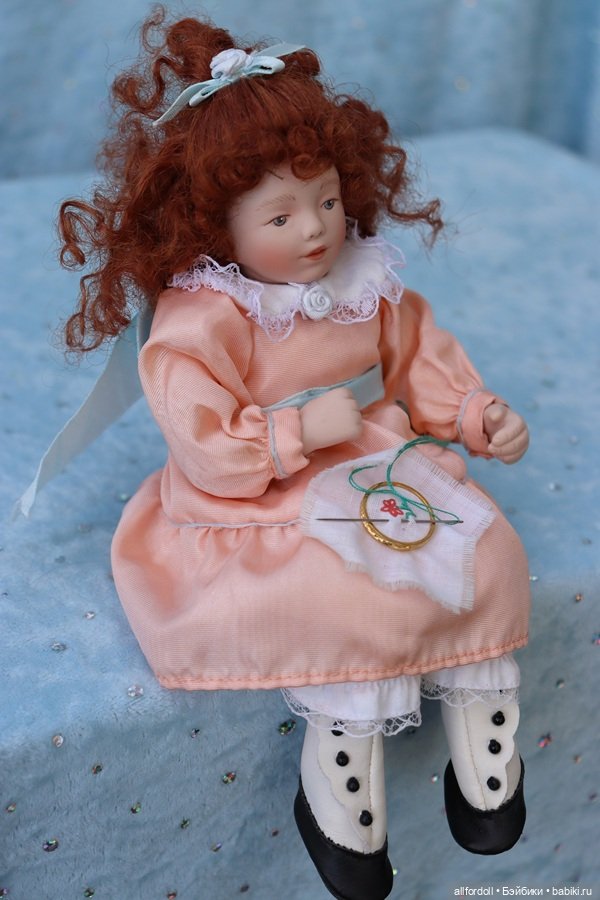 Маленькая барышня идет под названием Старомодная элегантность (Old Fashioned Elegance) она из original коллекции «Victorian Dreamers» от художника Kathy Barry Hippensteel для компании Ashton Drake Gallery. Создана она была в 1995 году и выпускалась только в течении 100 дней. Рост около 20 см. Состояние у нее вполне хорошее, но протереть фарфоровые части можно. Идет с миниатюрными пяльцами, причем с вышивкой и с иголкой. Мягко-набита. Рыженькая, кремовое платьице, старомодные ботиночки…
