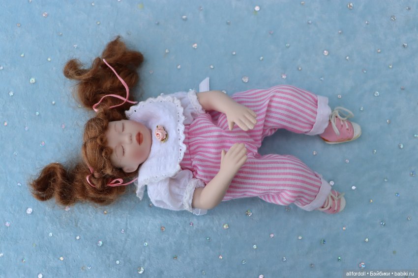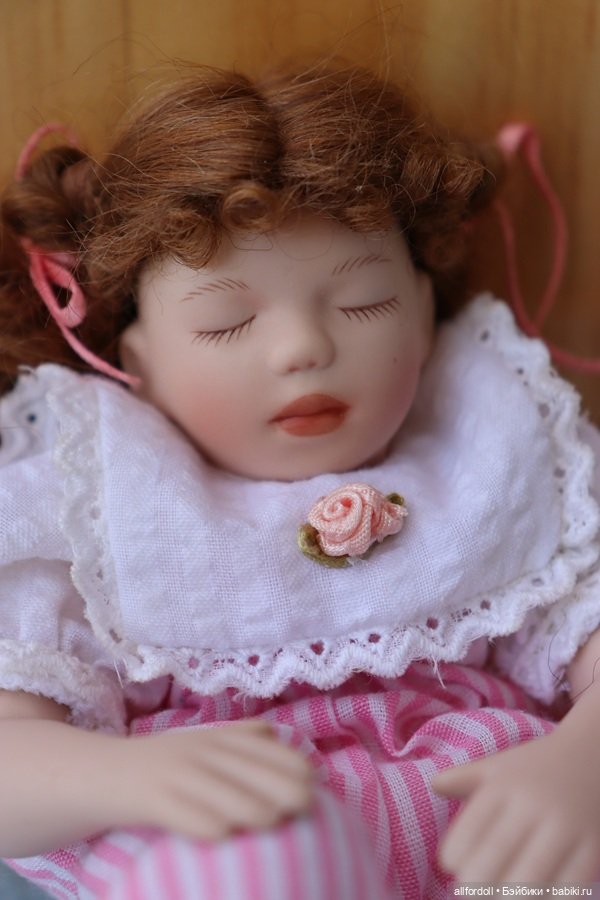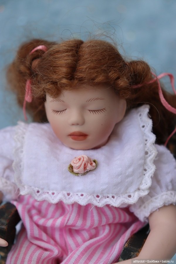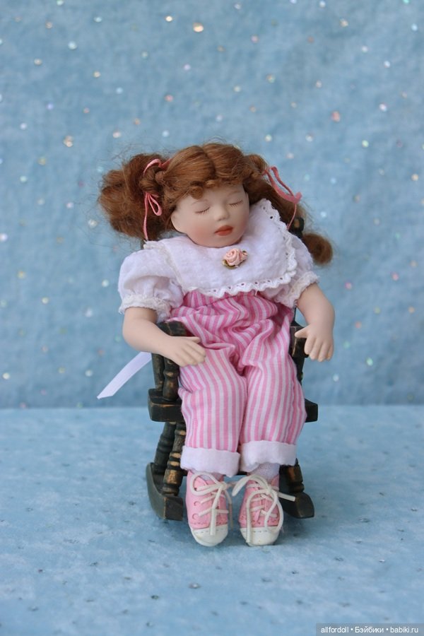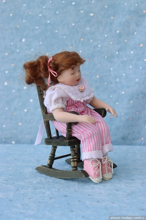 Маленькая спящая Леди идет под названием Викторианское время историй (Victorian Story Time) она из original коллекции «Victorian Dreamers» от художника Kathy Barry Hippensteel для компании Ashton Drake Gallery. Создана она была в 1995 году и выпускалась только в течении 100 дней. Рост около 20 см. Состояние у нее вполне хорошее, но протереть фарфоровые части можно. Идет с миниатюрным креслом-качалкой. Мягко-набита. Славный аутфит.