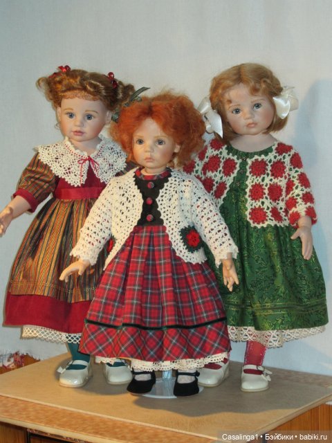 Волосы — мохер, глазки — стекло. Конструкция ножек предусматривает возможность посадить куклу.