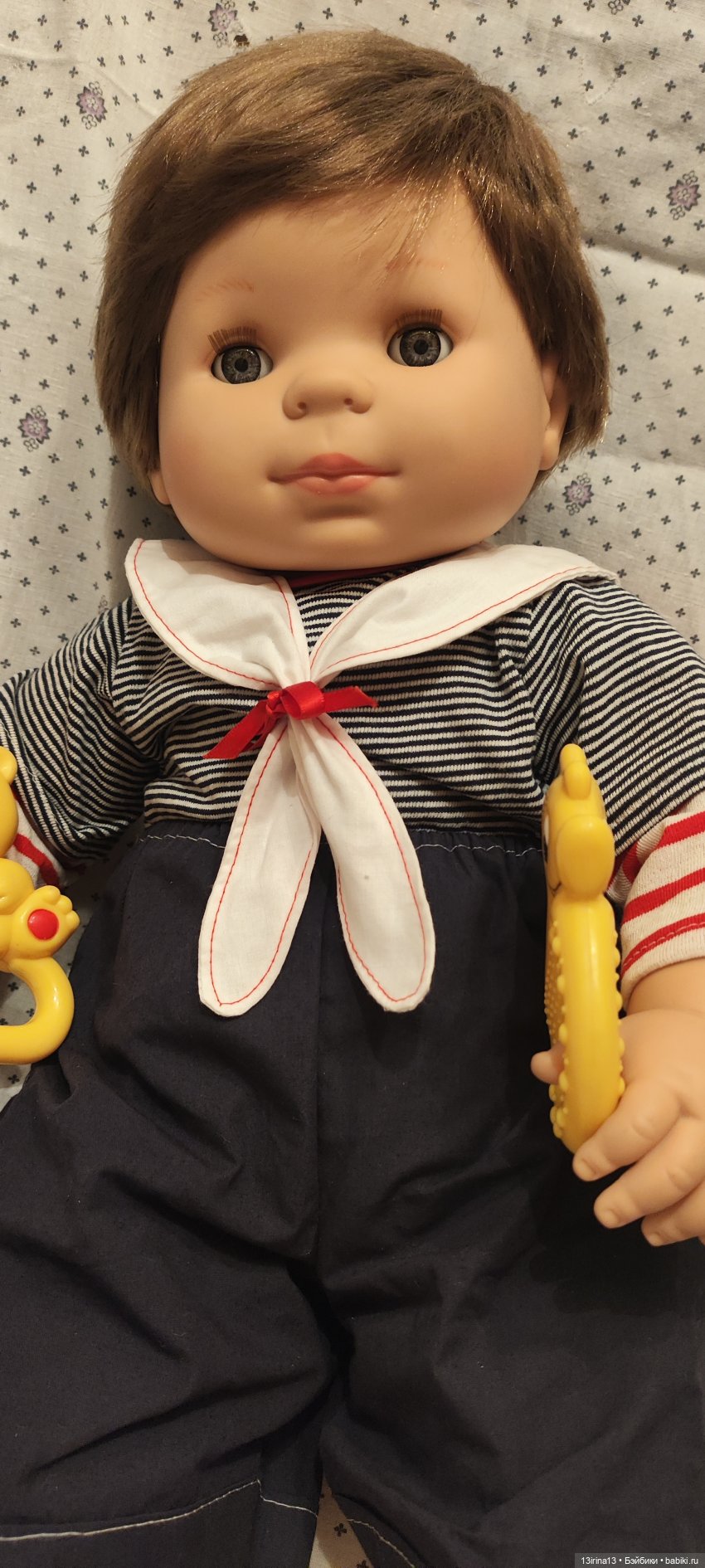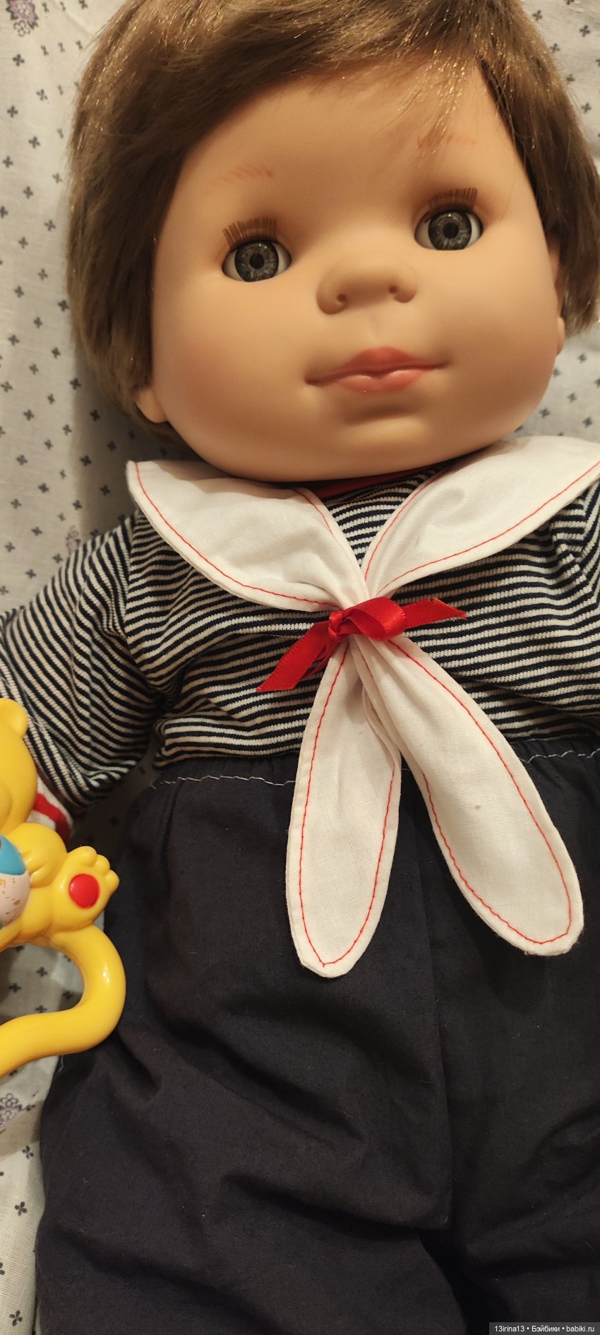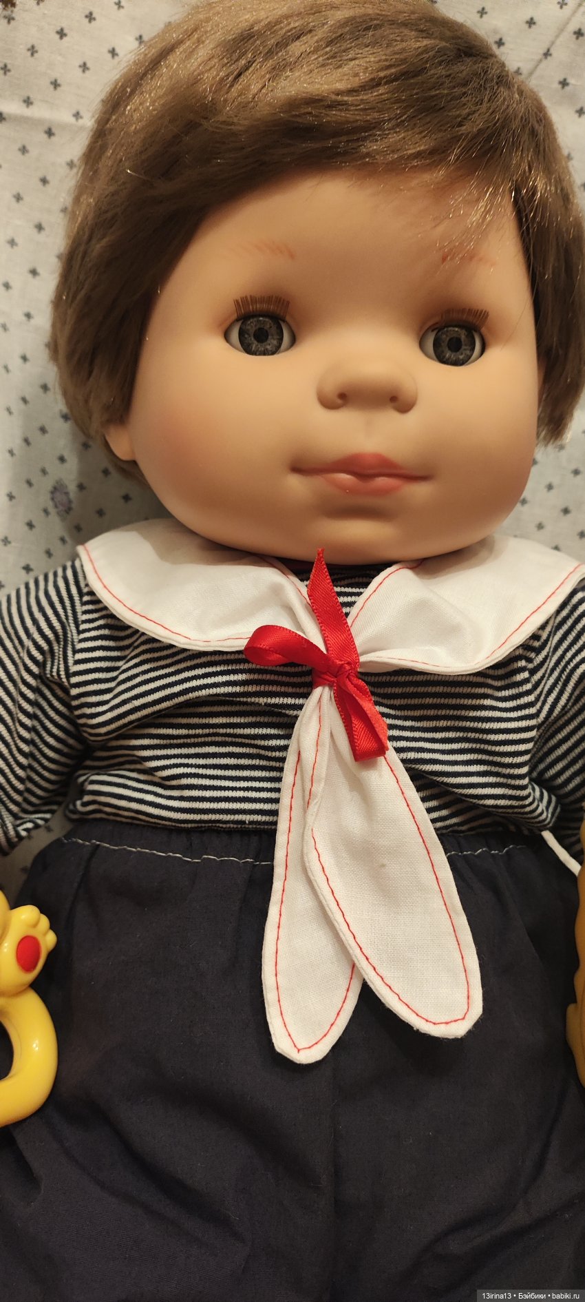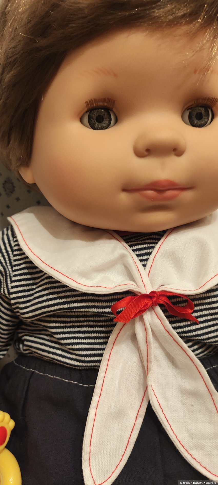 Очень тискательный, с густыми прошитыми волосиками, глазки закрываются, если положить куклу на спину!