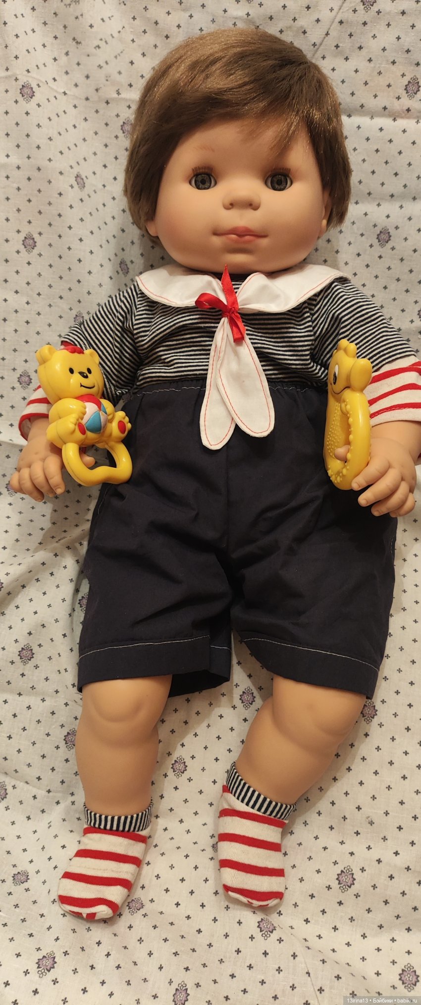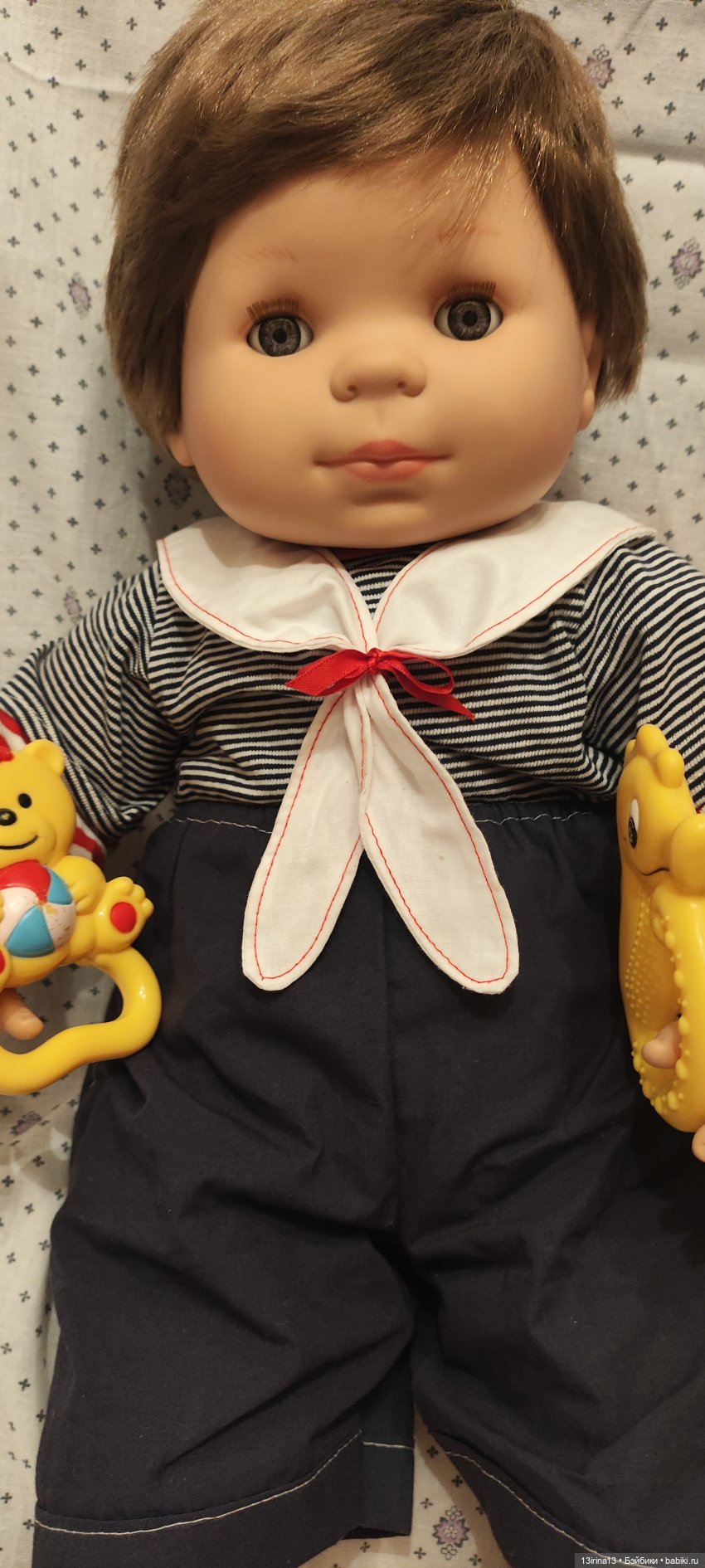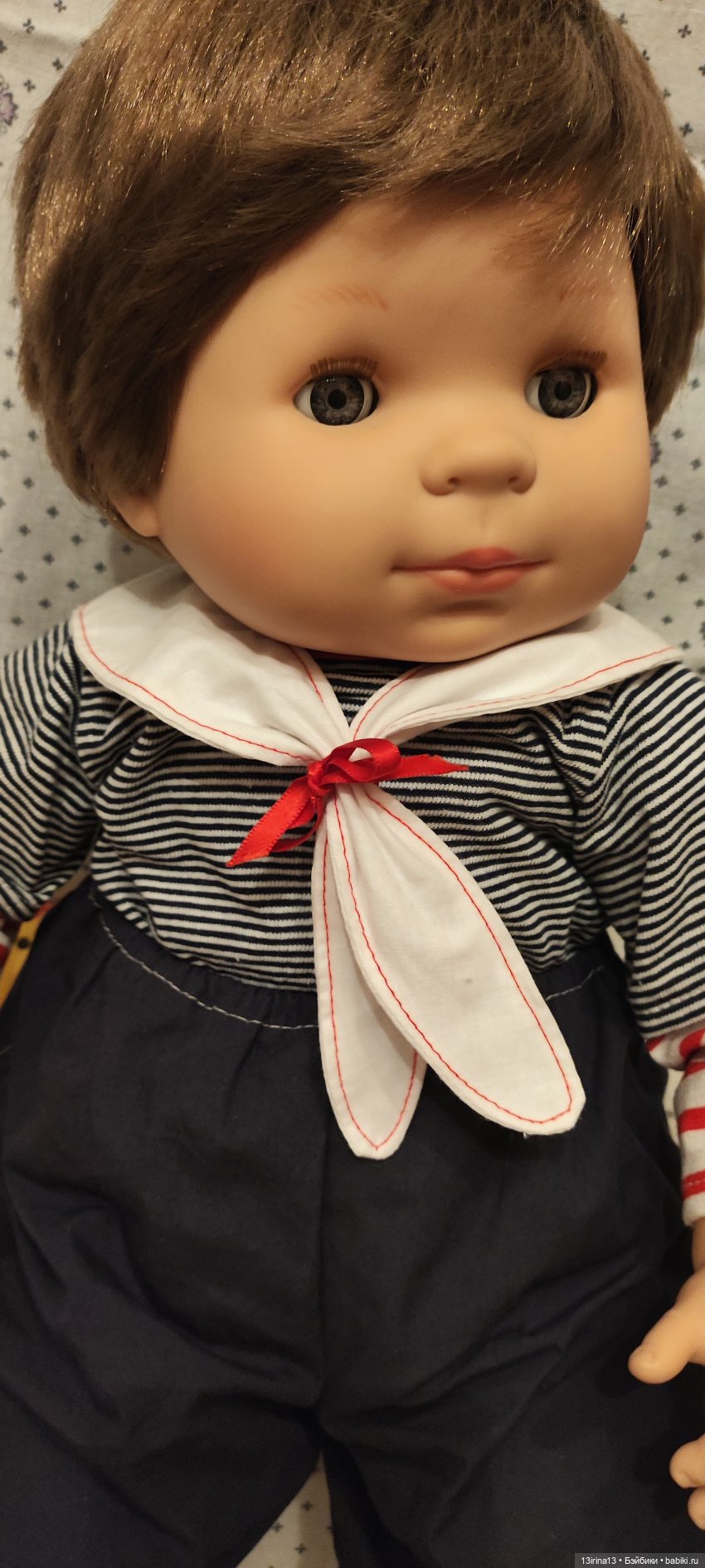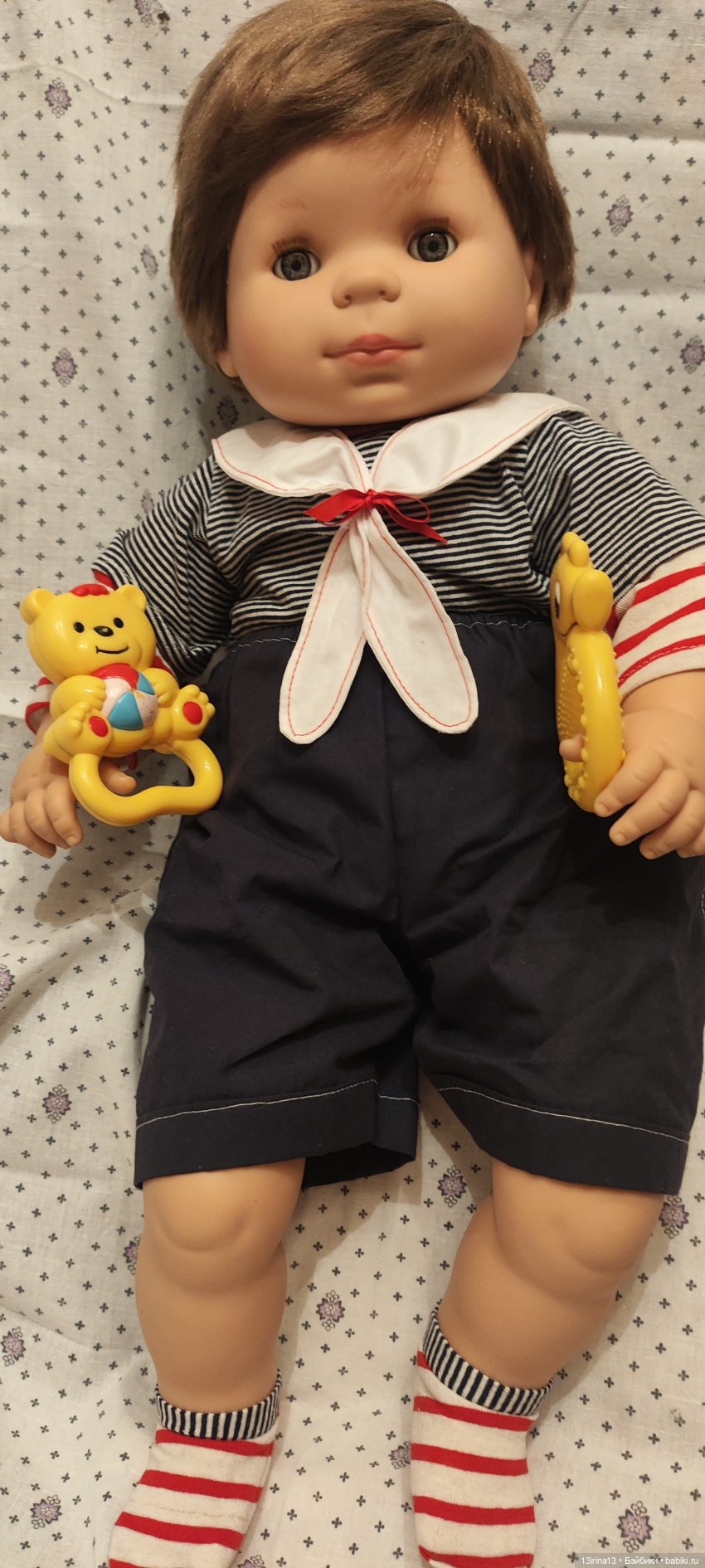 Очень тискательный, с густыми прошитыми волосиками, глазки закрываются, если положить куклу на спину!