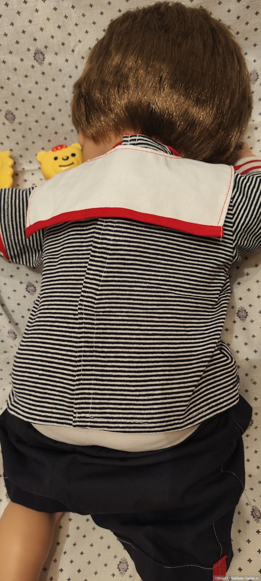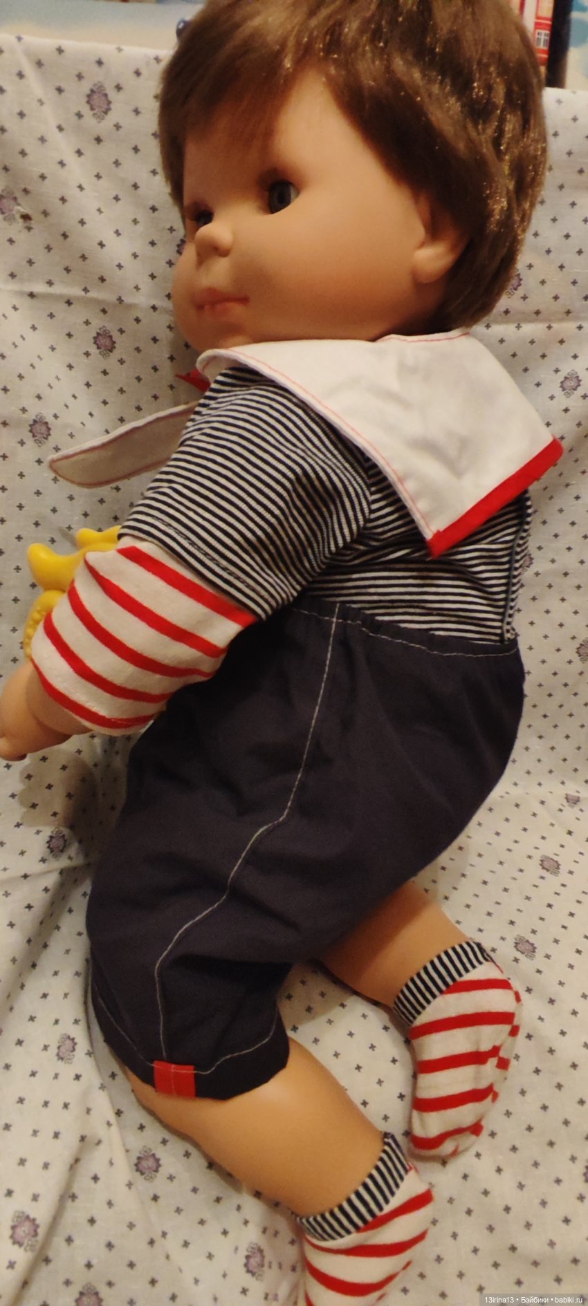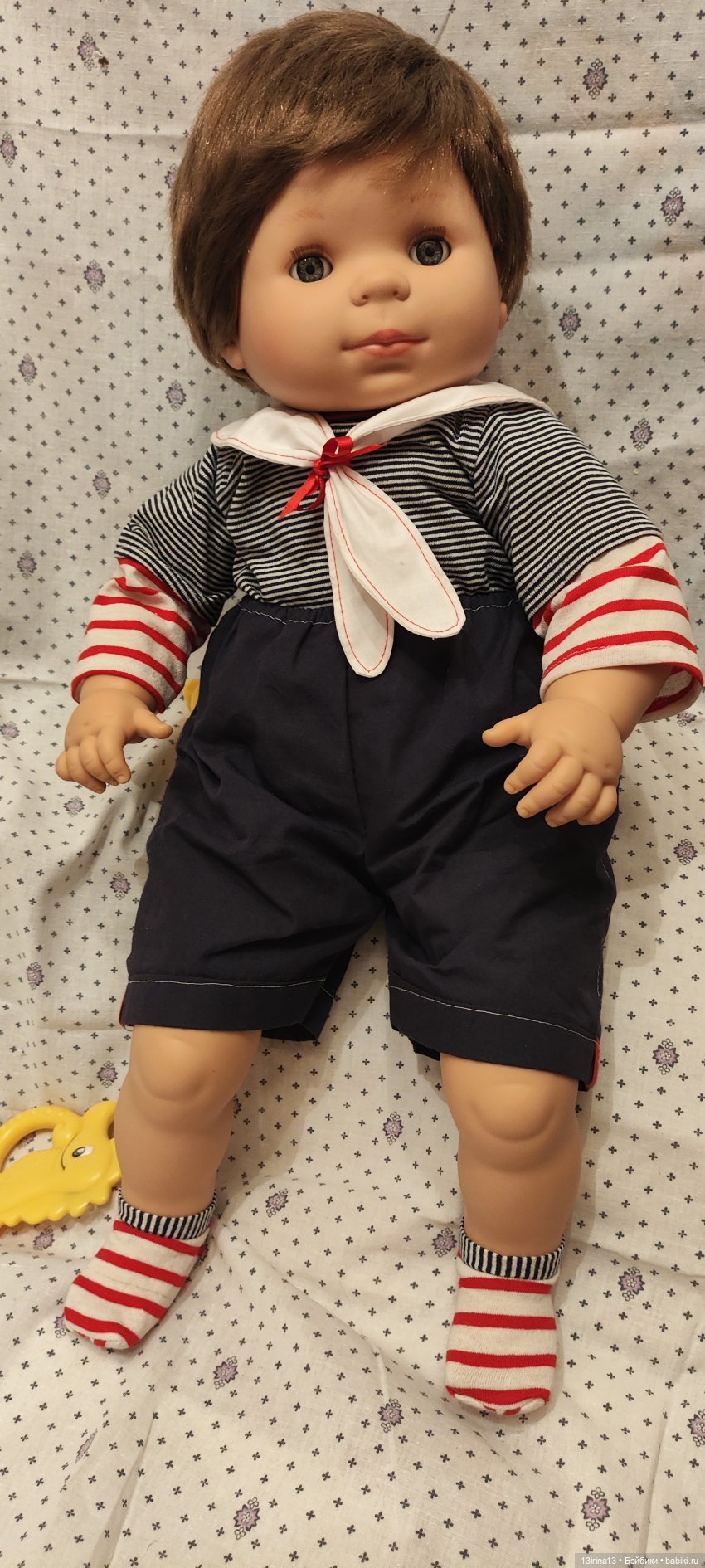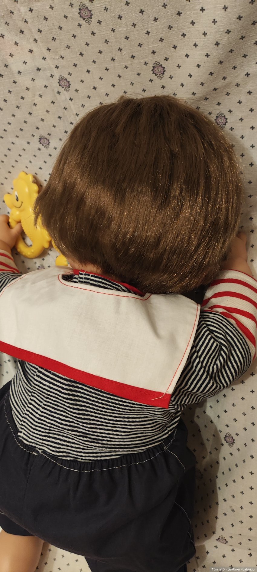 Очень тискательный, с густыми прошитыми волосиками, глазки закрываются, если положить куклу на спину!