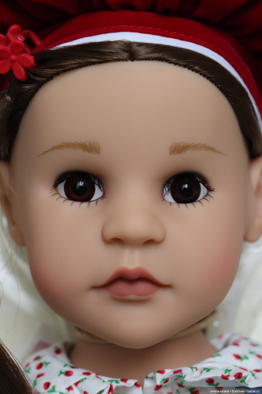 У куклы коричневые волосы и карие глаза-стекло.
