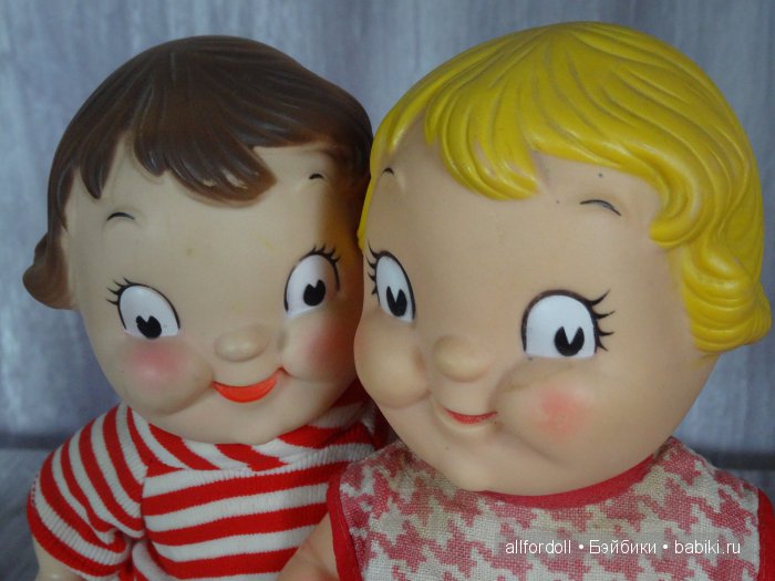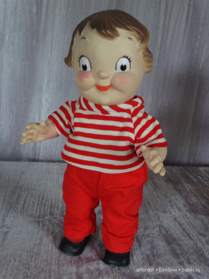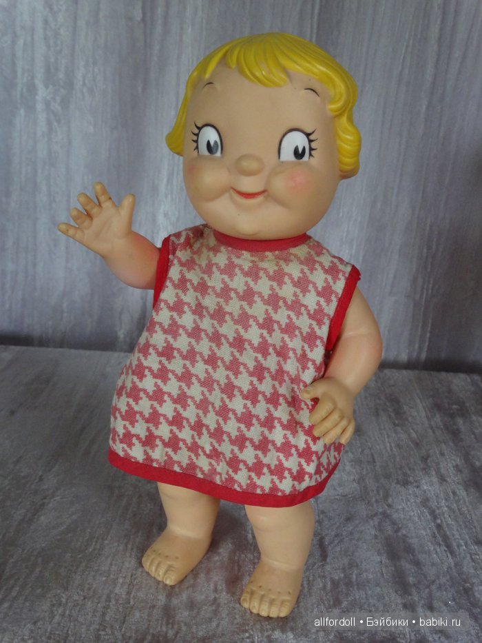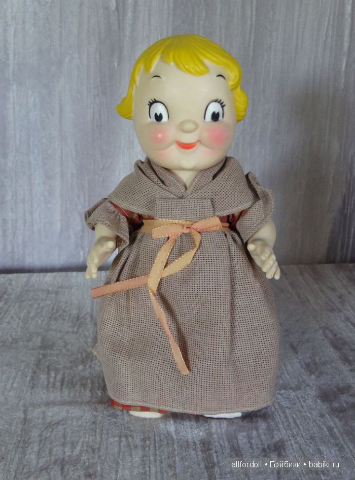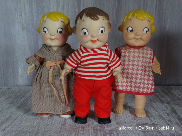 Эти малыши Dolly Dingle винтажные, были созданы компанией Campbell для рекламной акции в 1966 году. Мягковатый винил; руки, ноги, голова крутятся вокруг своей оси. Рост 24 см. Сделаны в США.