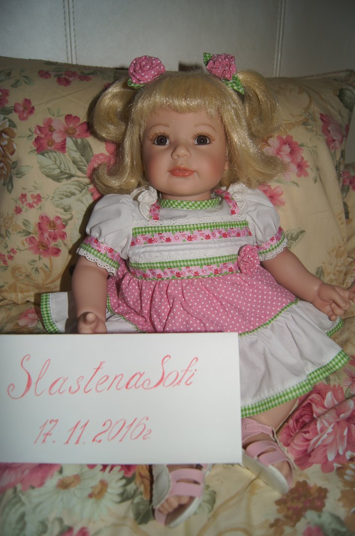 Доставала из коробки сфотографировать. Блондинка с карими глазами, кукла Адора выглядит эффектно и одета со вкусом! Панталоны и босоножки этой стильной куколки подобраны к платью по цвету, а ее волосы держат две узорные резинки с розами в горошек. Оригинальное название: Adora Polka Dot Rose.