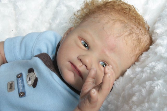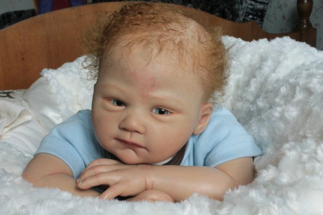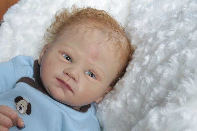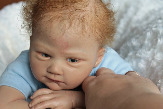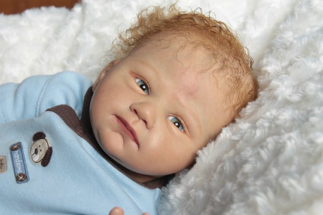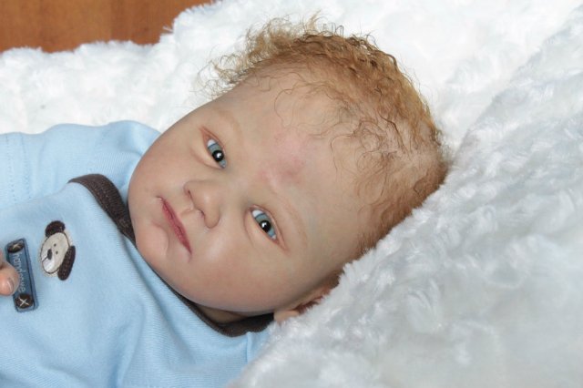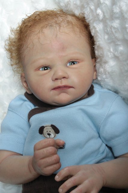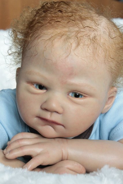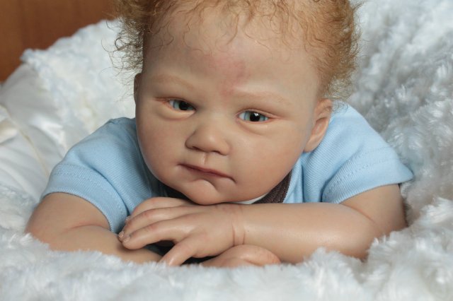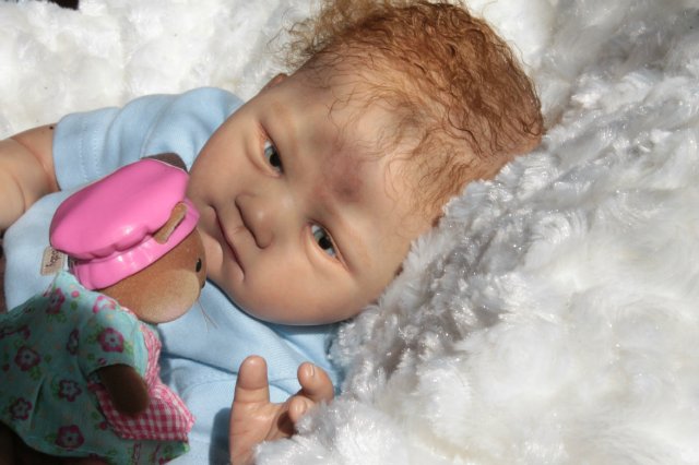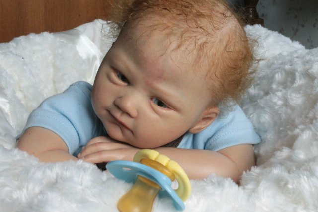 Раскрашена красками генезис во множество слоёв, волосики мохер, глазки стекло Лауша, утяжелена, имеет магнитную соску, с собой привезёт свидетельство о рождении, сертификат лимита, магнитную соску приедет в одежде как на фото голубая футболка и коричневые ползунки.