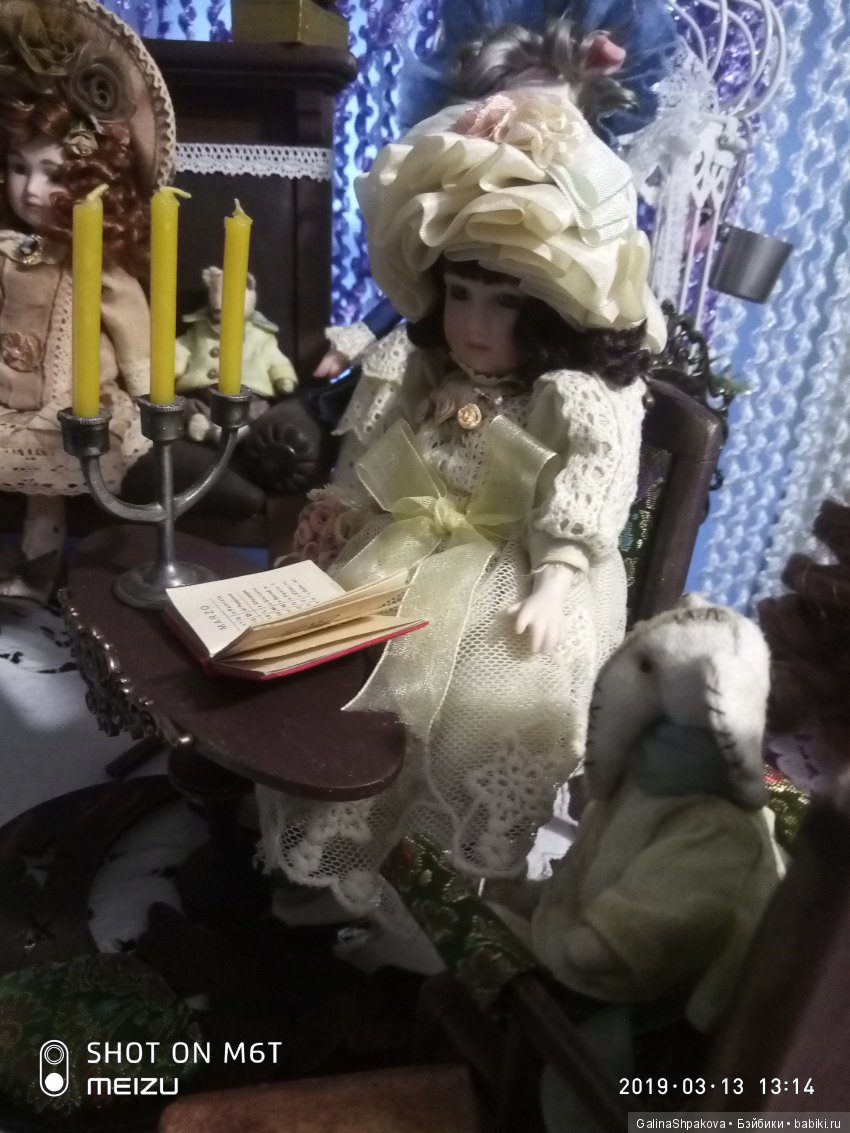 Редкость и эксклюзив. Неповторимый вид интерьера кукол, возможно их библиотеки, или читающая дама, в гостиной с красивым убранством.