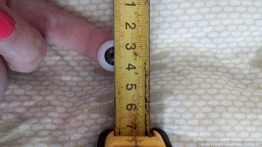 Положите глазик как на фото, на метр( в данном случае размер глазика 1см 4мм =14мм), то количество миллиметров, что занимает глазик и будет нужный Вам размер.