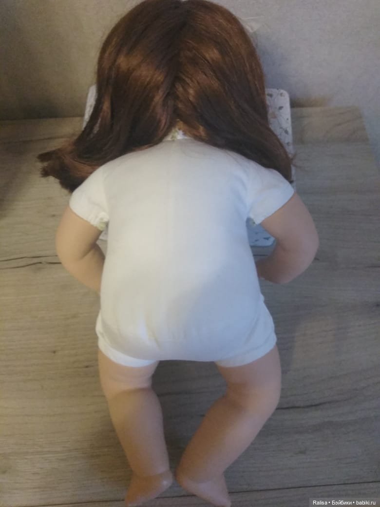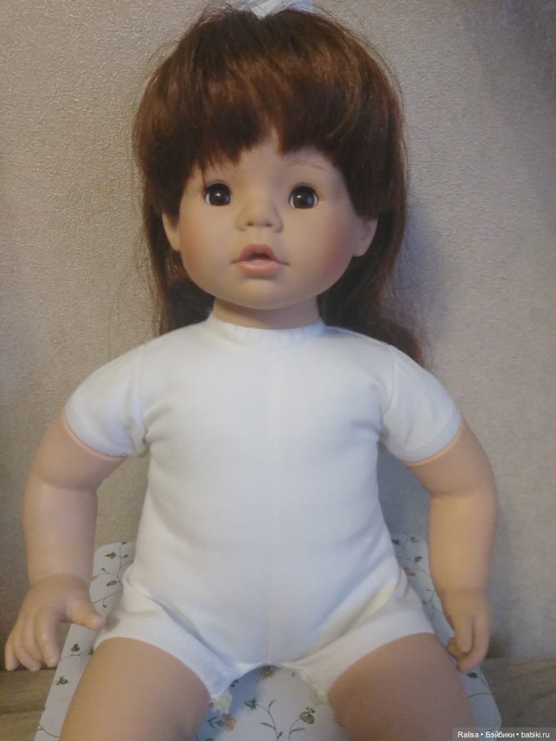Волосы прошитые каштановые с рыжиной, почти до пояса куклы, густые. Тело твердонабивное чистое. Механизм глаз «открытия-закрытия» работает. Есть пищик, работает.