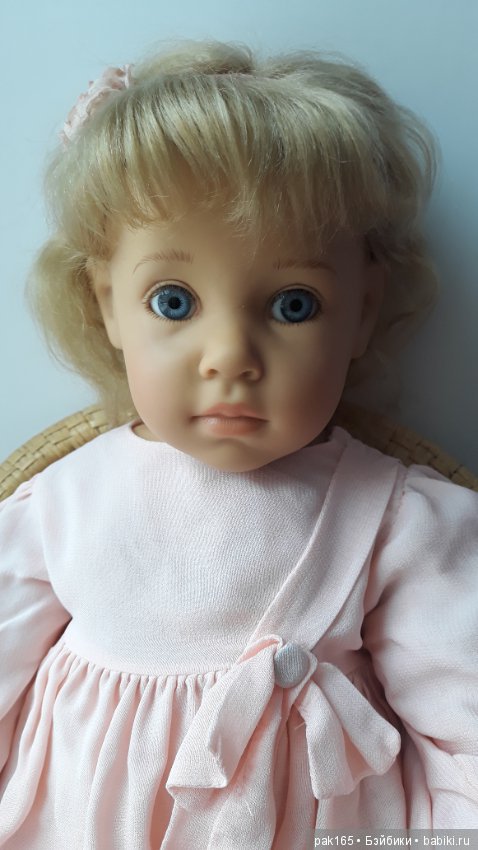 Маленькое чудо Алина куколка от Elizabeth Lindner. Рост: 22” (56 см) Год выпуска 1992 Серия Harmony, молд Lison. Коробки и документов нет. Комбинезон не родной, фирменный My Twinn, в нем ко мне приехала, по размеру, отлично сидит. Руки- винил 3/4, ноги – винил 3/4, коленочки чуть согнуты, за счет этого девочка сидит естественно, тело набивное, есть грудная пластина, зона шортиков набивная, голова шарнирная, может принимать различные положения. Кукла сидит самостоятельно, можно поставить со стендом (стенд не прилагается). Реснички длинные, густые, натуральные, без потерь. Волосы паричком из мохера, не мыла- сбрызнула кондиционером и руками сформировала кудряшки. Глазки голубые, без дефектов. Состояние матерчатого тела – чистое, винил без повреждений.