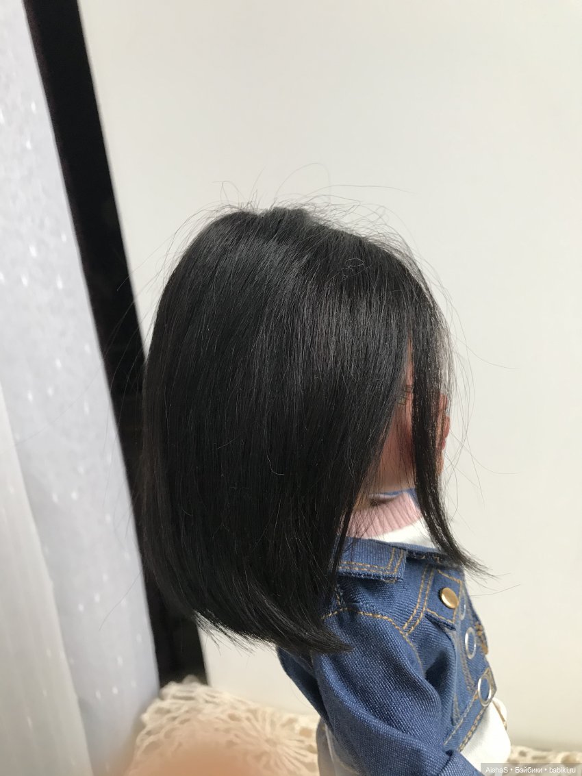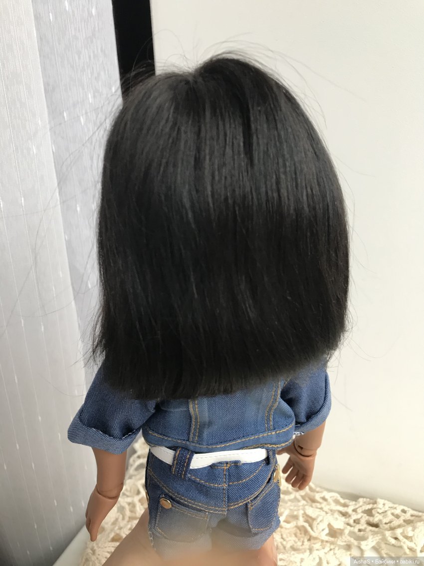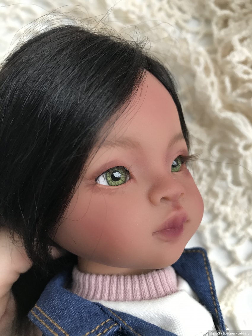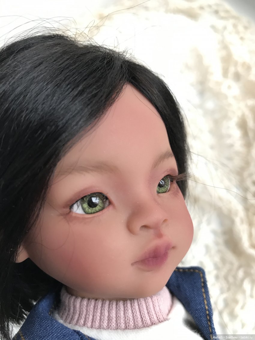 Куколке заменены глазки на стеклянные, сделан мейк, закреплён клиром. Волосы — трессовый парик из козочки, на голове сидит плотно, не приклеен. Тело: шарнирное корейское от kokobini. На ножке, ближе к пальчикам, имеются черные точки, скрыты под обувью, вид не портят, такое тело было изначально. На последнем фото показала. Аутфит: футболка, джинсовая курта, джинсовые шорты, кеды из замши.