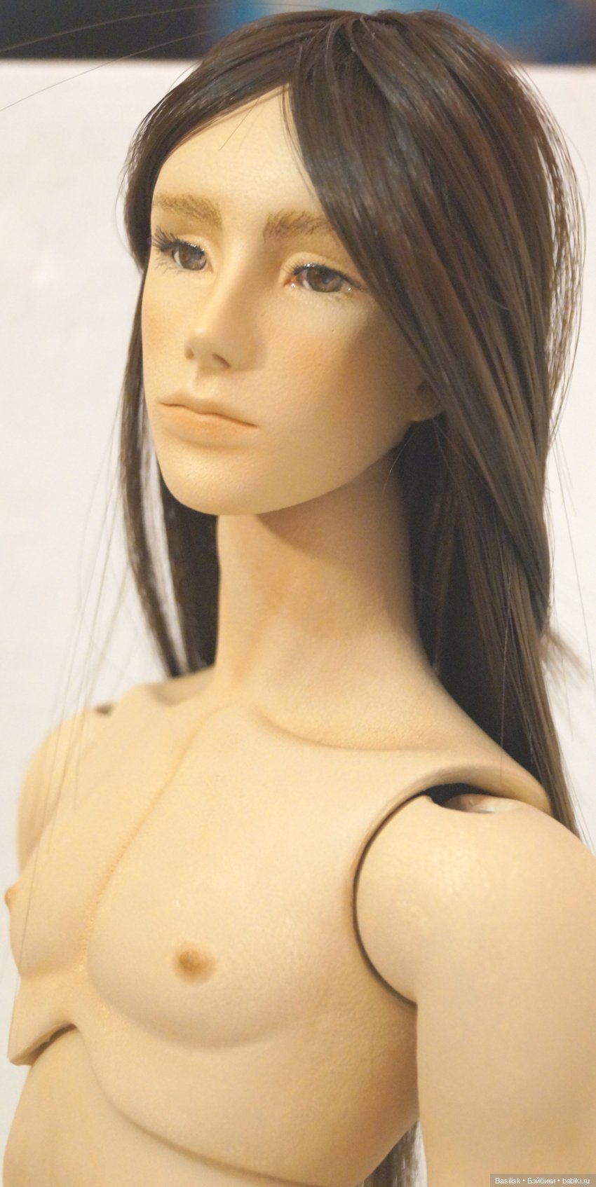 Шарнирная кукла юноша отлита из литьевого материала «Флюмо». Шарниры простые одинарные. Кукла окрашена акриловой краской поверх деталей (не в шликере), поэтому имеются потертости и недокрашенность деталей. Тонирована пастелью и акварельными карандашами. Краска закреплена акриловым лаком. Кукла собрана на резинку. Шарнироприемники куклы проклеены горячим клеем. Волосы (парик на магнитах) сделаны из синтетических трессов. Глазки у куклы вставные, сменные. Самостоятельно кукла стоит неуверенно, позы держит слабо (особенно в бедрах и коленях).