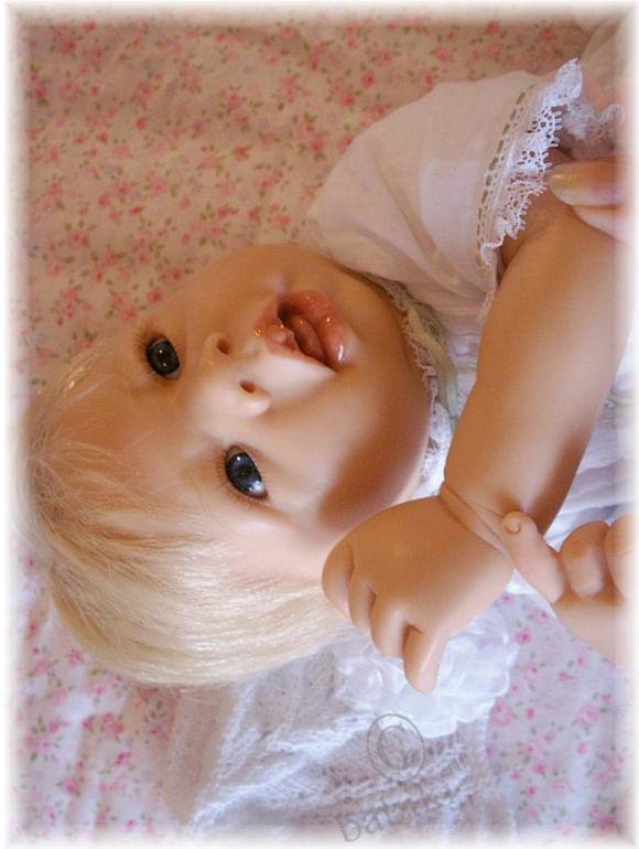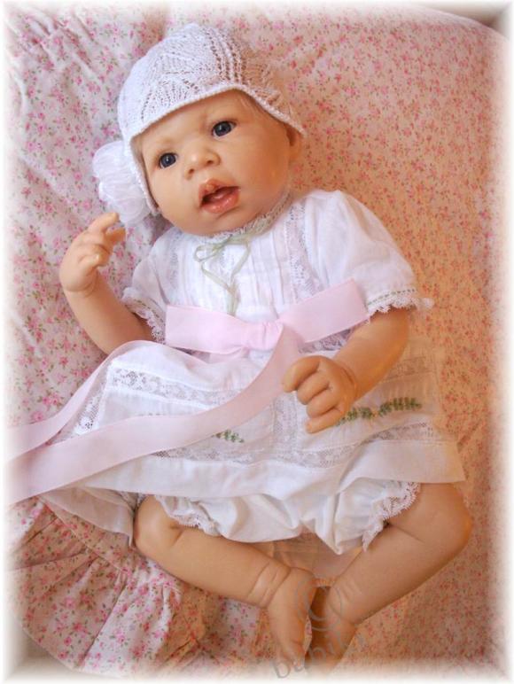 Куколка одета в красивую одежду из батиста с вышивкой, вязанной шапочкой, есть в наборе одеяльце-фото Nr.6, прекрасно завершающее презентацию куклы.
