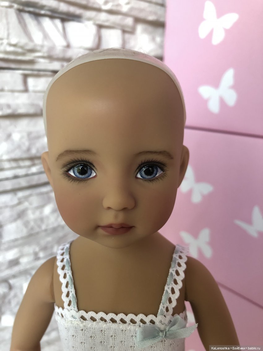 У куклы светлые волосы, блондинка, серо-голубые глаза, цвет тела тан.