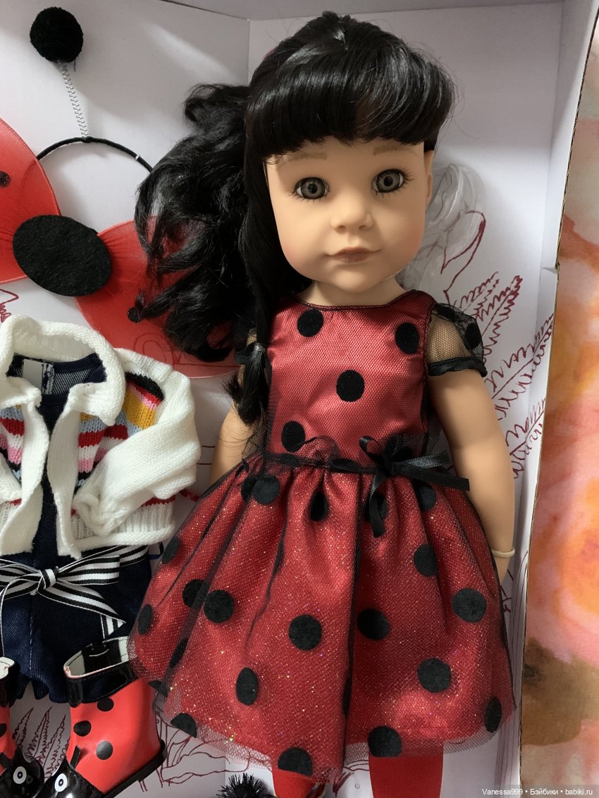 Абсолютно новая в коробочке жгучая брюнетка Ханна Божья коровка(Ladybug) от Готц(Gotz).Полный комплект.Девочка из коллекции 2018г.Рост 48 см.Полностью виниловая,5 точек артикуляции.Стоит и сидит самостоятельно.Тело обычное классическое.Волосы тёмные с чёлочкой, прошиты по всей голове, можно мыть и делать разные причёски, с волосами ни чего не произойдёт.Глазки светло-карие с ресничками не закрываются.Ханночка продаётся с 2-мя аутфитами: основной аутфит божьей коровки и дополнительный.В комплекте документы, брошюрка.Куколка будет прекрасным подарком как для ребёнка, так и для взрослого коллекционера.