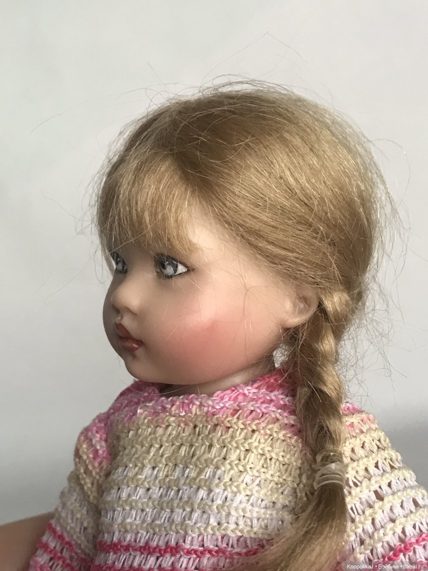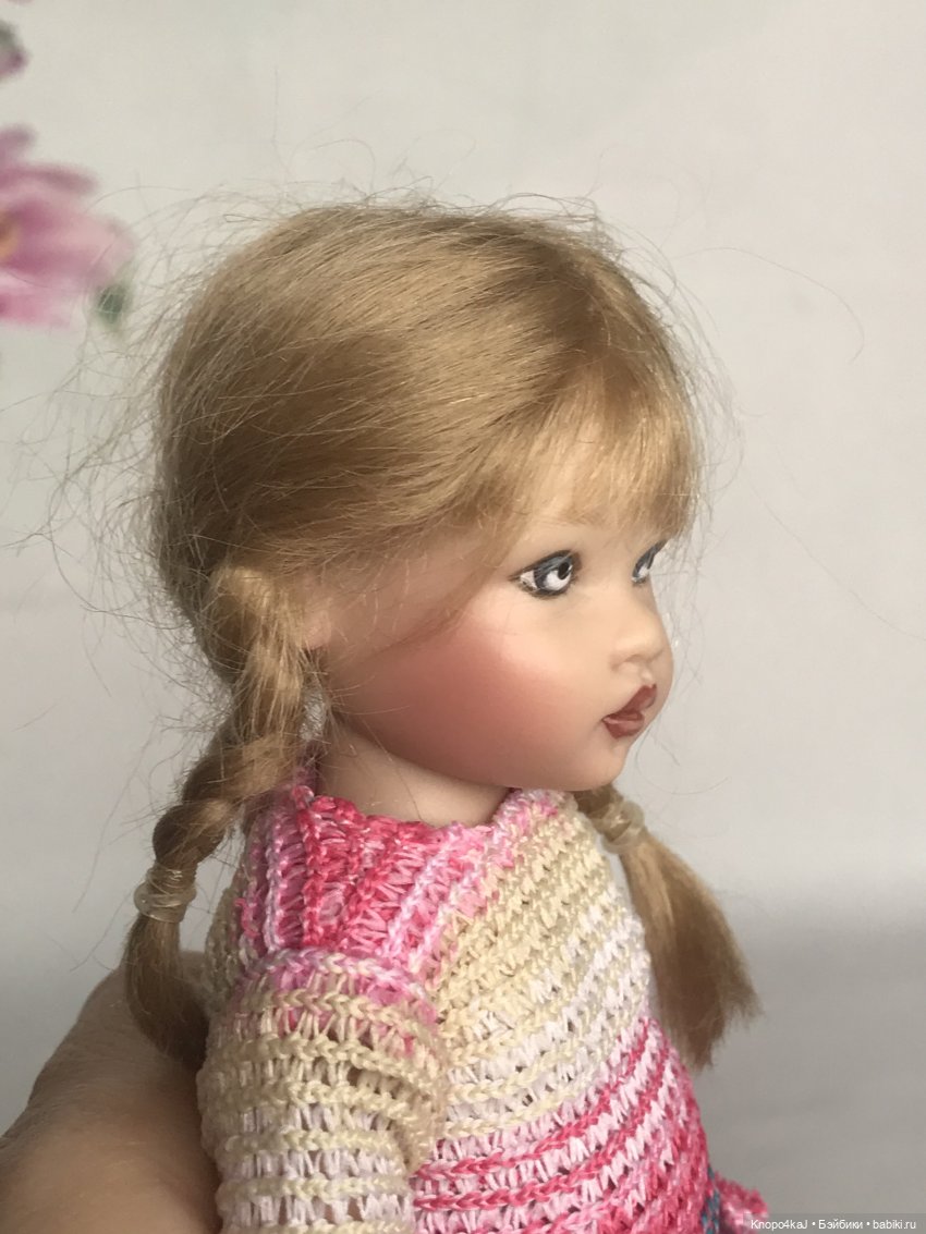 Рост 19 см, не шарнирная, виниловая. В вязаном платьице, колготках, шапочке и с рюкзаком.