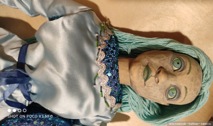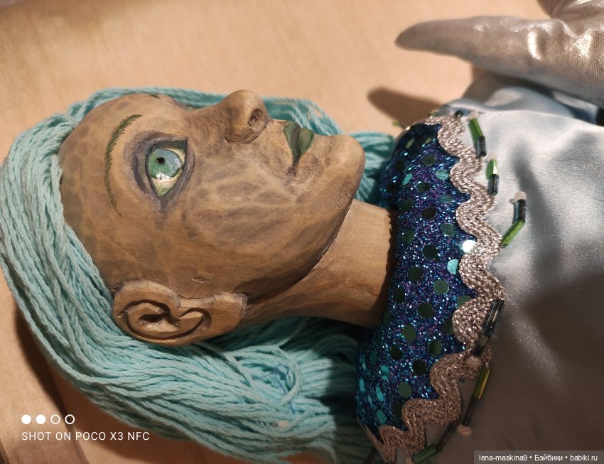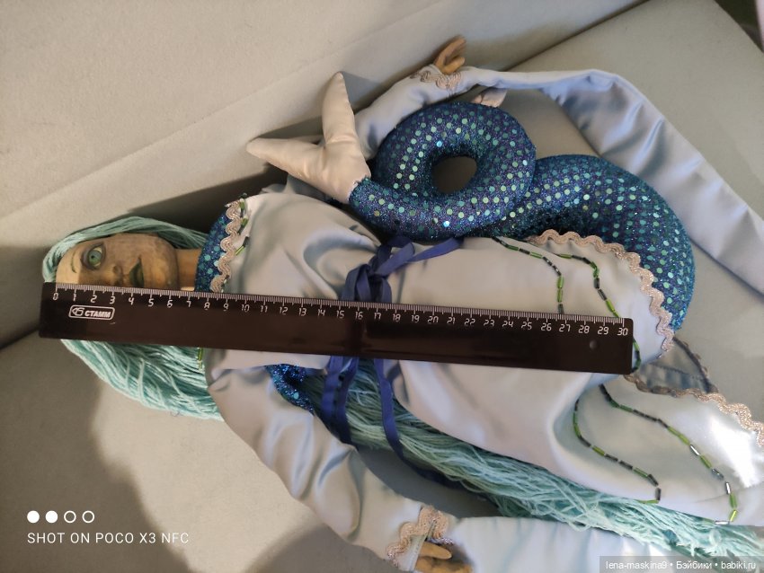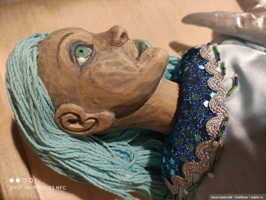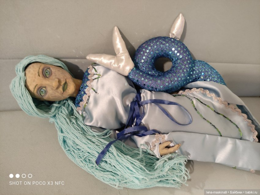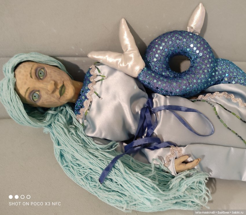Русалка, голова, руки сделаны из дерева- поворотные. Остальное, мягконабивное. Наряд расшит бисером, тесмой, атласный и тд… волосы из ниток. Можно, посадить, положить, или с корягой сделать композицию, у меня так именно сидела. В отличном состоянии. Если что то не понятно, пишите пожалуйста в личке. С.ув. Елена.