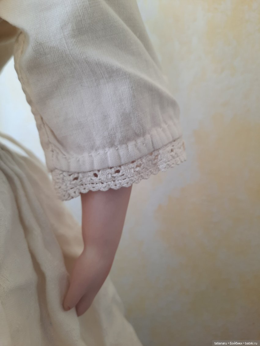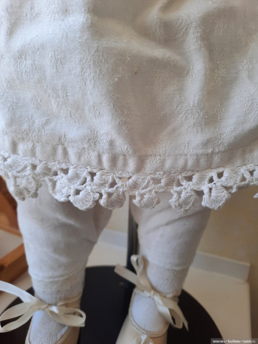 58 см рост. Фарфоровая голова и руки, дефектов нет, на шее-шов отливки. Брови не формованные. Спящие глаза на рокере. Аутфит: чулочки, туфли, панталоны, нижнее платье, нижняя юбка с кружевами, выполненными крючком вручную, рубашка с кружевом и верхняя юбка. Выполнено всё из старого хлопка. Состояние прекрасное. Больше фото в комментариях.