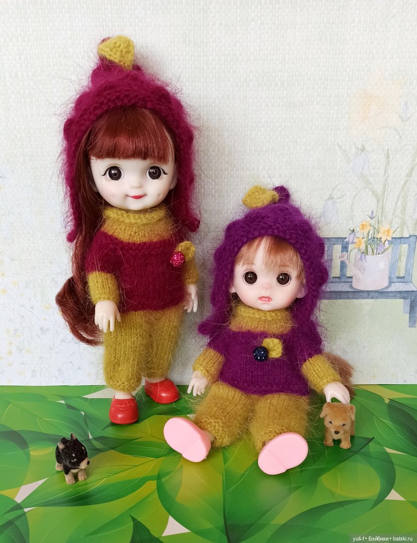 Рада вас приветствовать, доброго дня!) Представляю вашему вниманию ягодный микс: 2 комплекта для Баболи «Малинка» и «Ежевичка». Связаны из пуха норки, получились очень нежные и пушистые. Основной цвет салатовый, у ежевички цвет верха и шапочки фиолетовый, у малинки цвет почти не передался — он ближе к свекольному. Добавляю для наглядности промофото пряжи. Комбинезоны застёгиваются сзади на 2 пуговки. Шапочки также можно застегнуть на пуговку. Связаны узором «Малинки».