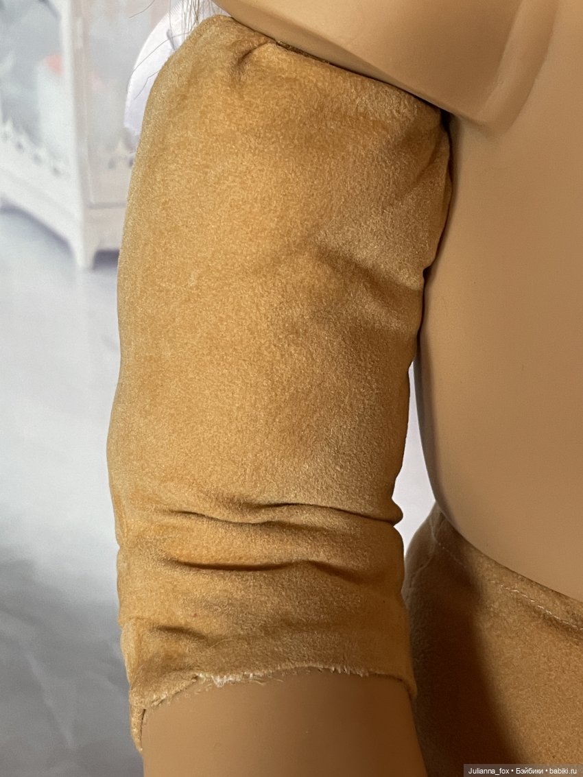 Руки винил на три четверти, ноги до колен. Большая грудная и спинная вставка. Тело велюровое, набивное, утяжелено гранулятом. В коленях и руках каркас, поэтому ноги и руки можно ставить в разные позы. Малышка может сидеть (в том числе с согнутыми ножками) и стоять с опорой. Голова поворотная.