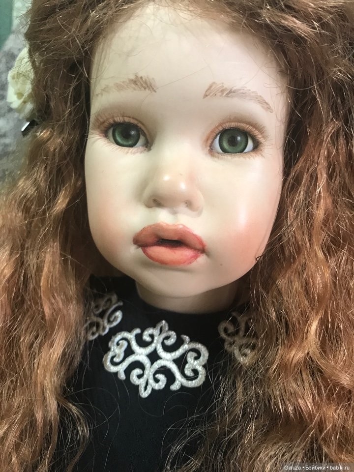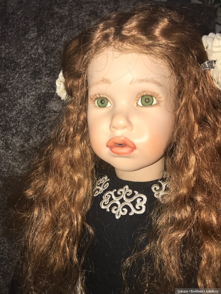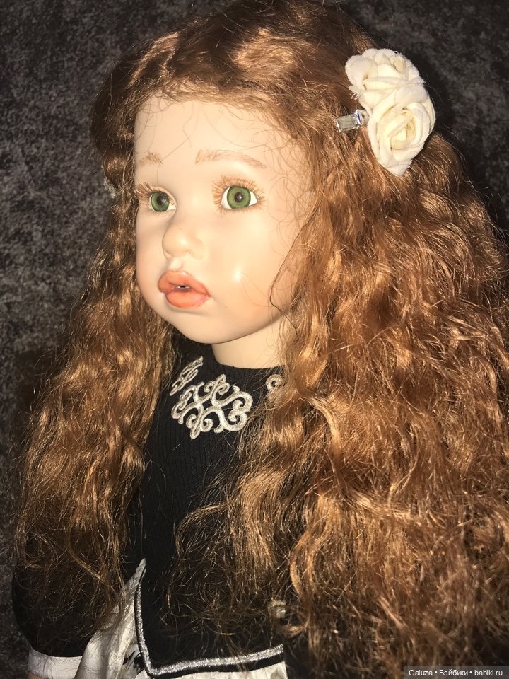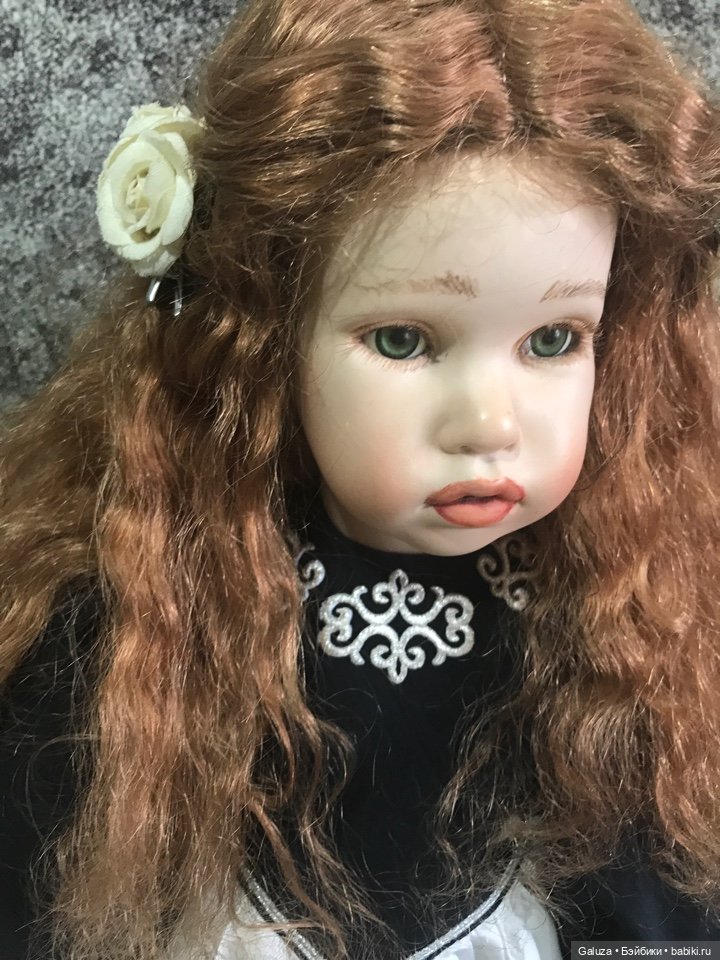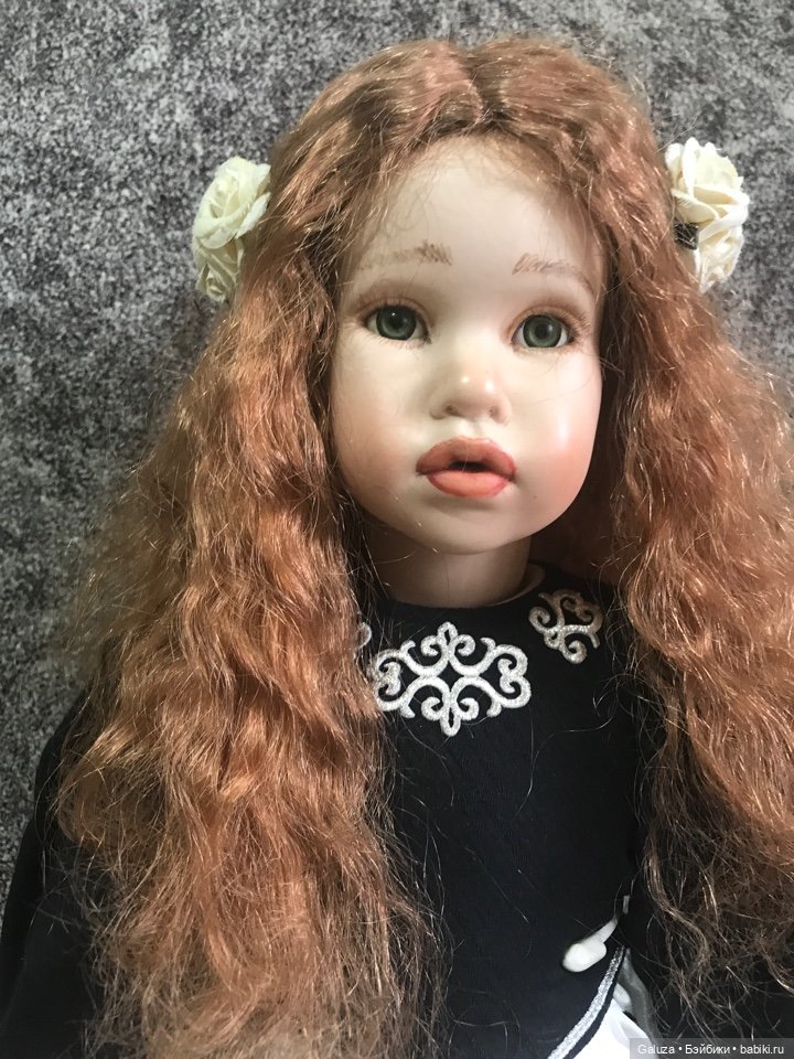 Анна -София от Aase Thorsen. Рост -68 см. Поворотная голова на неглубокой грудной пластине, руки до локтя фарфор, ноги выше колена фарфор, очень стройное флисовое тело. Парик новый из человеческих волос, по размеру головы, поэтому не приклеен, нет необходимости, я тоже не стала клеить. На затылке имеется клеймо. Торсен. Анна-София. 1993г. На пластине 1987г. Цвет фарфора одинаковый. Сколов и трещин нет.