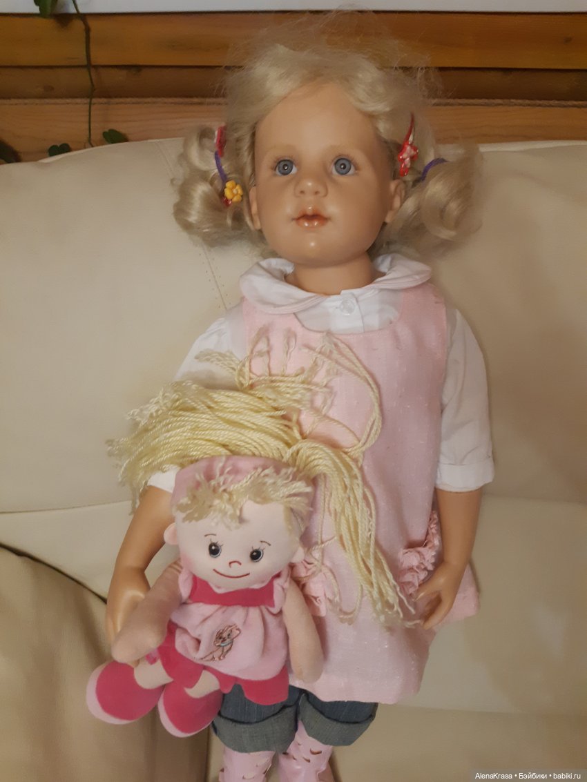 Милая, нежная белокурая девочка от знаменитой немецкой художницы Hildegard Günzel. Головка, ручки, ножки и грудная пластина выполнены из специального прочного материала резин, на ощупь похожего на фарфор. Это придает коже куколки гладкость и красивую матовую белизну. Куколка без трещин и изъянов 'не новая'но хорошее состояние. Глазки очень красивые, голубые 'родной аутфит